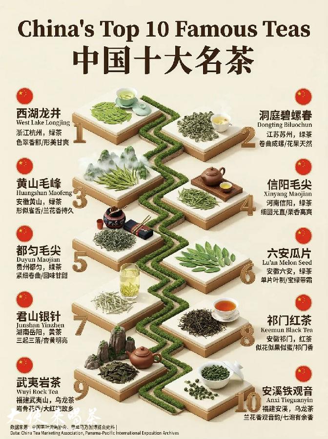 经过评选,在众多茶叶中,有10种来自不同产地的茶叶是比较出名。